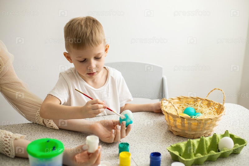 Ребенок и его мама красят яйца. На столе краски и плетеная корзина. Пасха