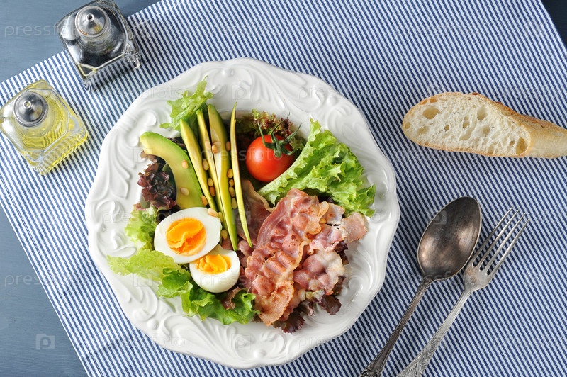 Завтрак с беконом, авокадо, яйцом и салатом