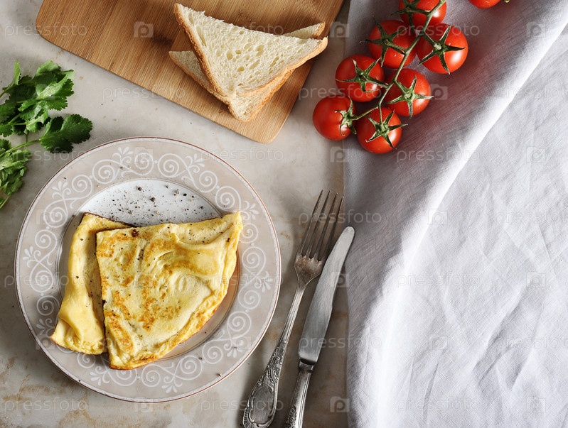 Омлет на тарелке, петрушка, помидоры, тост