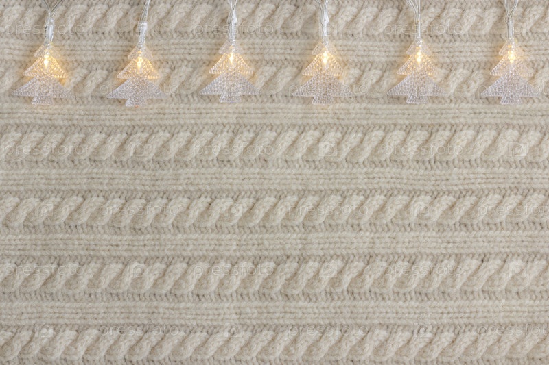 Рождественская мишура и электрическая елка в форме гирлянды на белом вязаном фоне