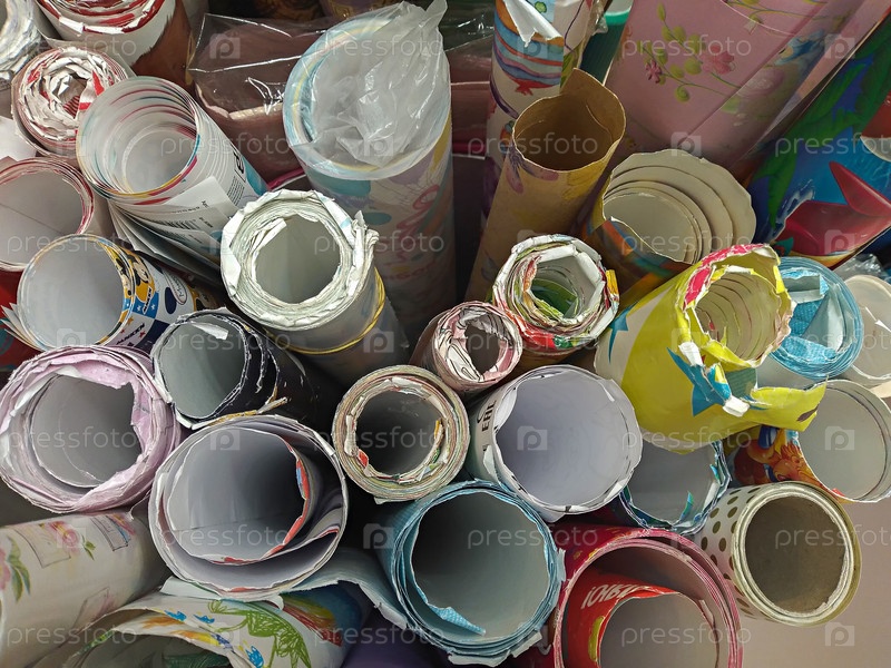 Много красочных рулонов оберточной бумаги, разноцветная оберточная бумага на прилавке магазина, разноцветные бумажные пакеты с лентами