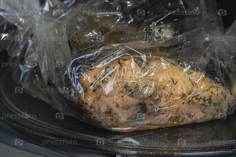 Сохранить Скачать Предварительный просмотр Свежая форель со специями, завернутая в рукав для выпечки в микроволновой печи, приготовленная, крупным планом