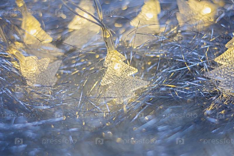 Рождественская мишура и электрическая елка в форме гирлянды на белом вязаном фоне