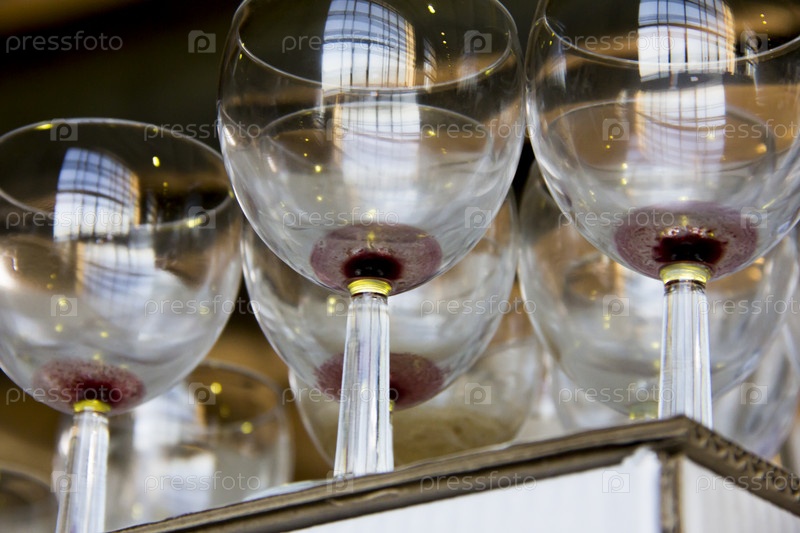 Бокалы и бутылки на столе после открытия и презентации выставки