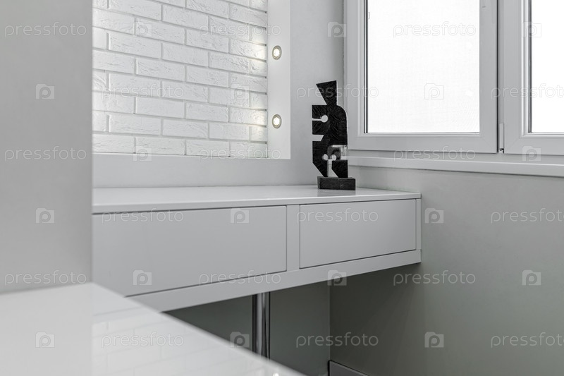 Современный интерьер лоджии белого цвета с подсветкой, столом и окном