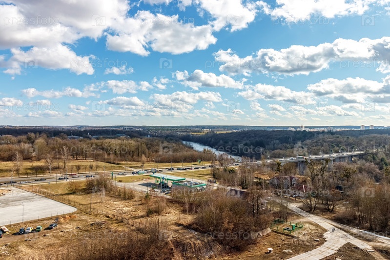 Вид с балкона на реку и промзону с голубым небом и облаками