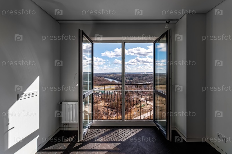 Пустая квартира с большим окном от пола до пола с видом на природу и голубое небо с облаками