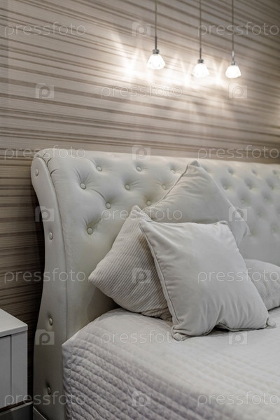 Светлая спальня с большой белой кроватью и изголовьем капитоне