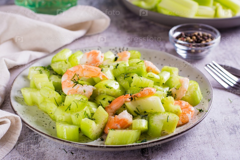 Свежий салат из сельдерея и креветок на тарелке для вегетарианской диеты