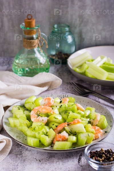 Свежий салат из сельдерея и креветок на тарелке для вегетарианской диеты по вертикали