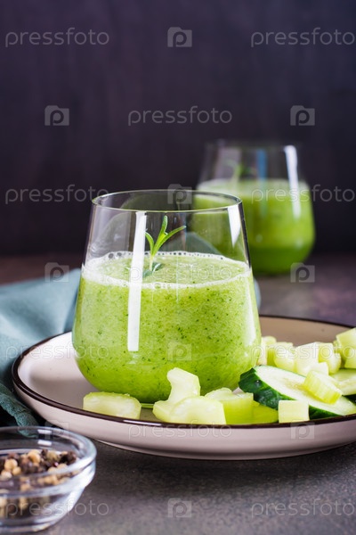 Смузи из свежего зеленого огурца и сельдерея в стекле для вегетарианской диеты по вертикали
