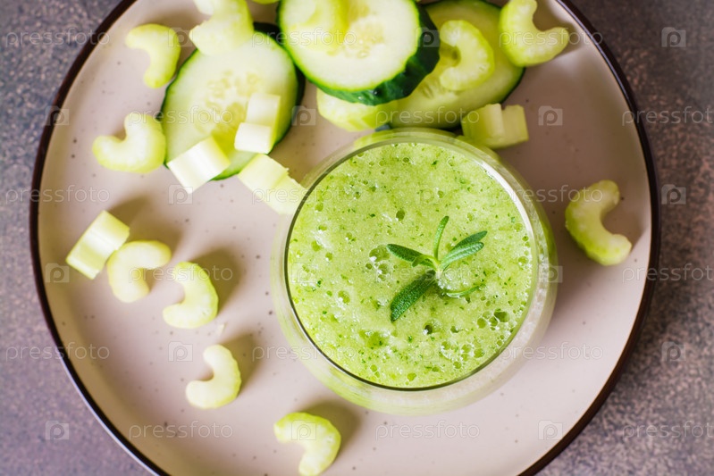 Смузи из свежего зеленого огурца и сельдерея в стакане для вегетарианской диеты, вид сверху крупным планом
