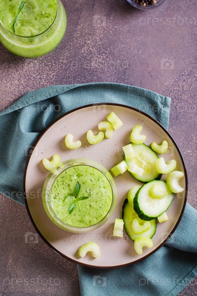 Смузи из огурца и сельдерея для вегетарианской антиоксидантной диеты в стекле на столешнице и вертикальном виде