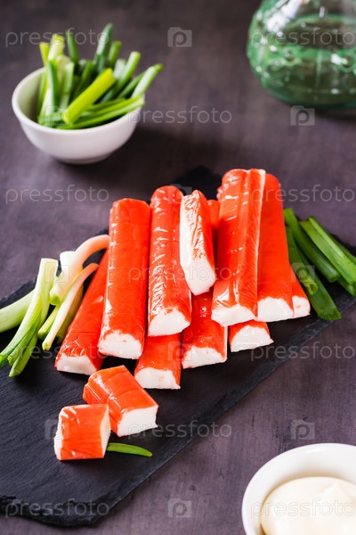 Острые крабовые палочки и зеленый лук на каменной доске и соус в миске на столе. Вертикальный вид