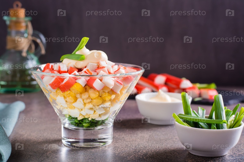 Крабовый салат из рыбных палочек, яиц, лука и кукурузы в миске на столе
