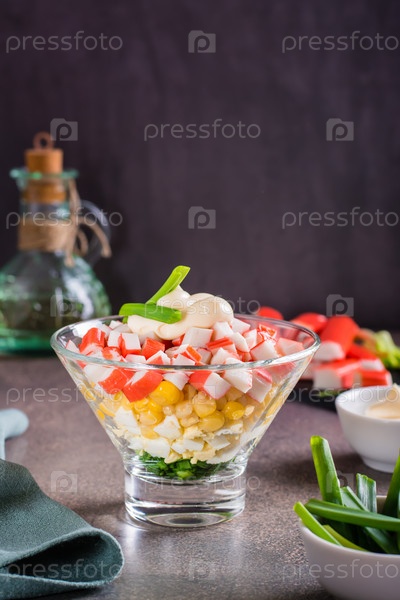 Крабовый салат из рыбных палочек, яиц, лука и кукурузы в миске на столе. Вертикальный вид