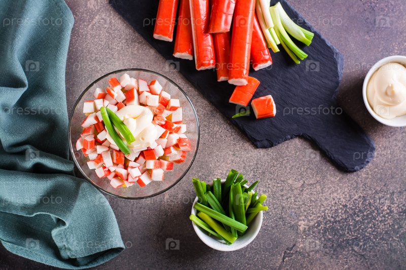Крабовый салат из рыбных палочек, яиц, лука и кукурузы в миске на столе. Вид сверху