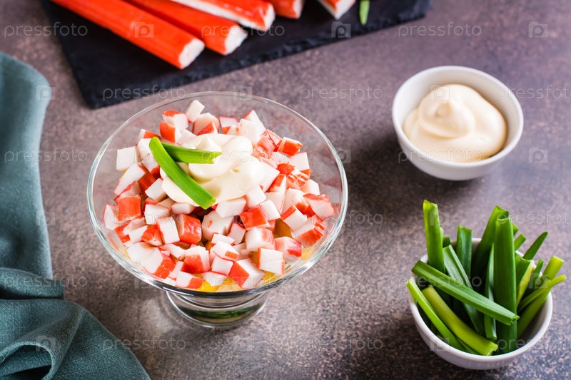 Домашний салат из крабовых палочек, яиц, зеленого лука и кукурузы в миске на столе