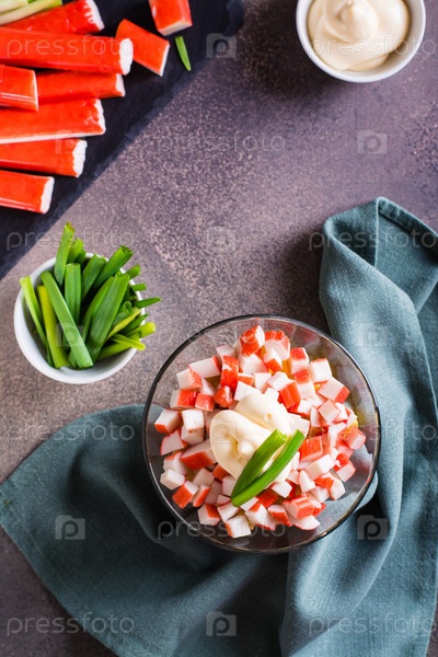 Домашний салат из крабовых палочек, яиц, зеленого лука и кукурузы в миске на столе. Верхний и вертикальный вид