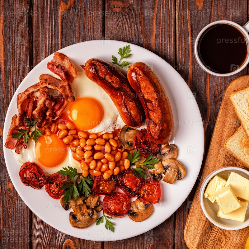 Традиционный полный английский завтрак с яичницей, сосисками, фасолью, грибами, помидорами на гриле и беконом на деревянном фоне