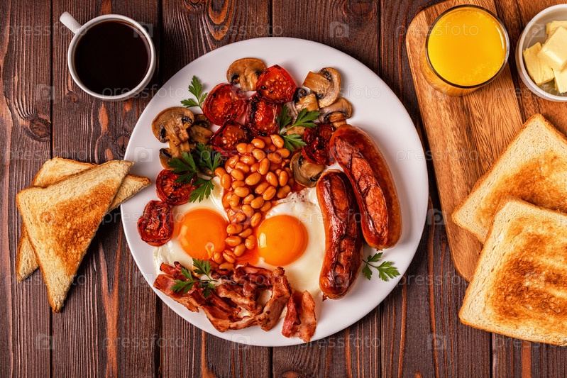 Традиционный полный английский завтрак с яичницей, сосисками, фасолью, грибами, помидорами на гриле и беконом на деревянном фоне
