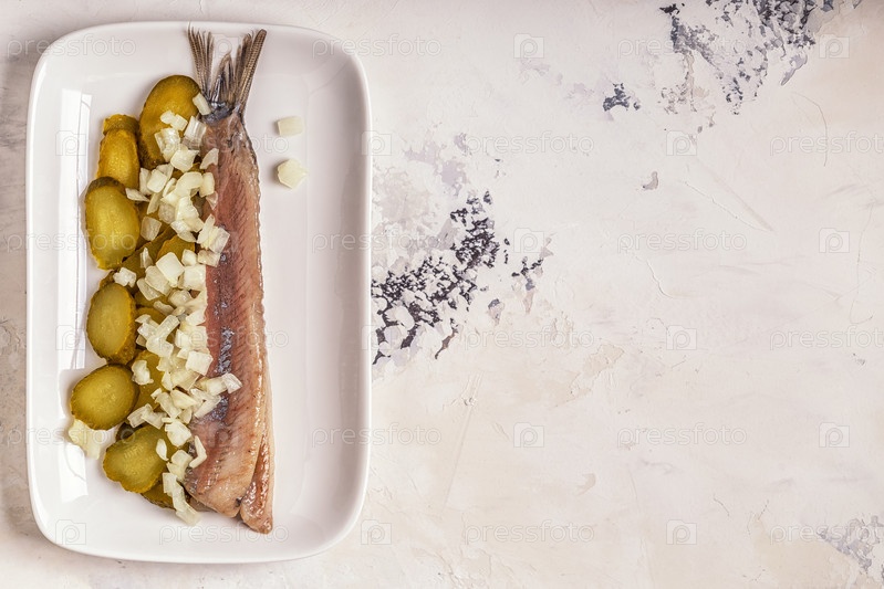 Традиционная голландская сырая сельдь с луком и солеными огурцами