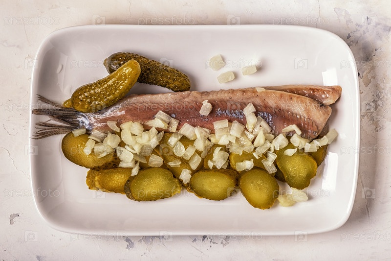Традиционная голландская сырая сельдь с луком и солеными огурцами
