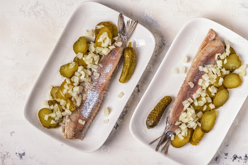 Традиционная голландская сырая сельдь с луком и солеными огурцами
