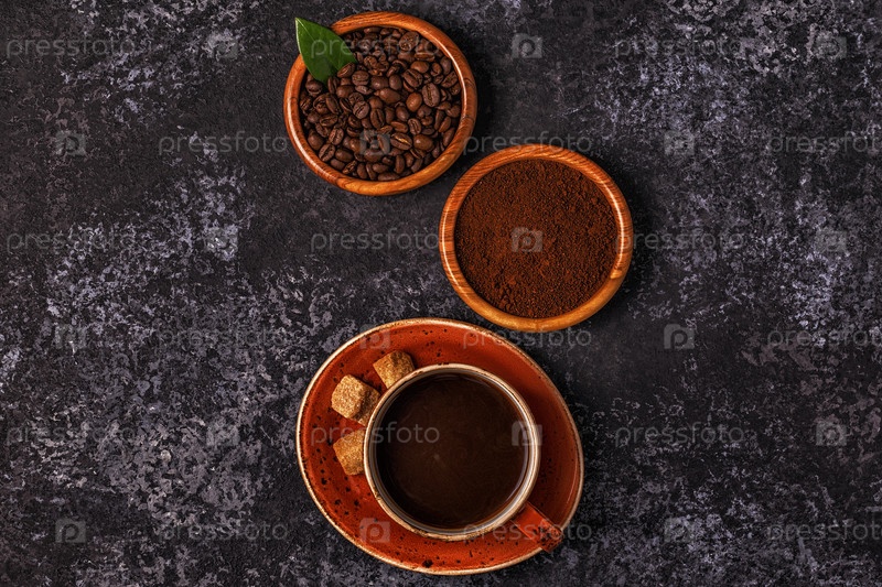 Кофейная чашка, бобы, молотый порошок и сахар