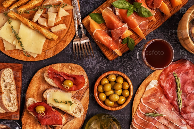 Фон итальянской кухни с ветчиной, сыром, оливками