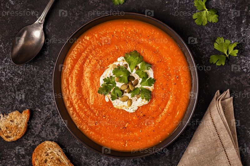 Тыквенно-морковный суп со сливками, семечками и петрушкой