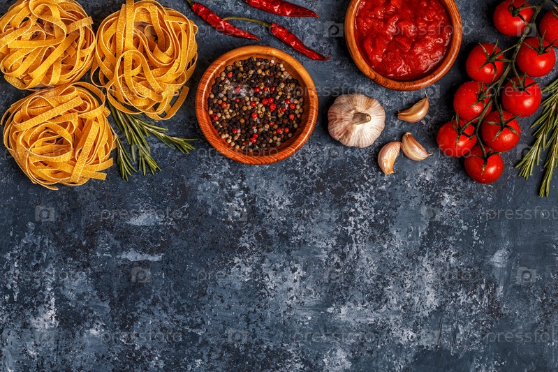 Фон итальянской кухни с макаронами, специями и овощами