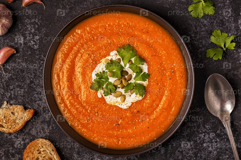 Тыквенно-морковный суп со сливками, семечками и петрушкой