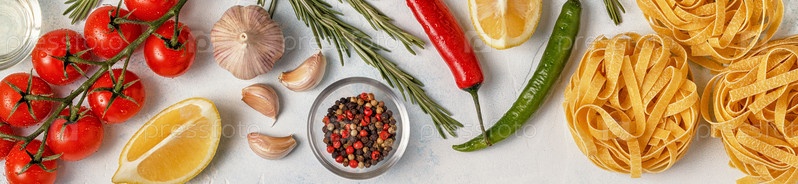Фон итальянской кухни с макаронами, специями и овощами