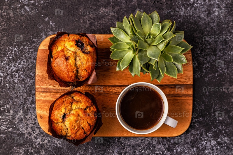 Стол с кексами, цветком и кофе