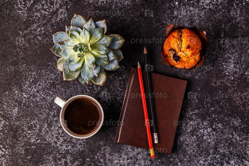 Стол с блокнотом, цветком и кофе