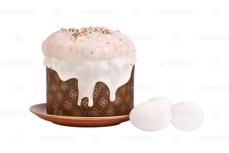 Пасхальный кулич и куриные белые яйца на белом фоне