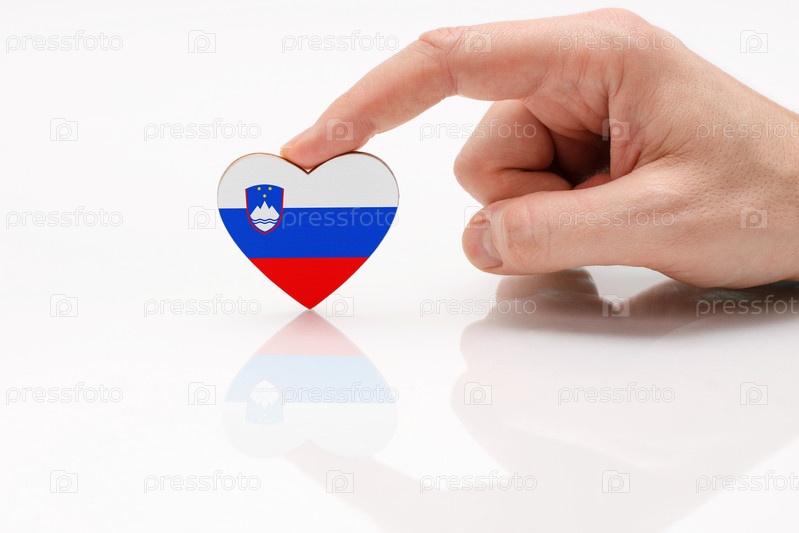 Флаг Словении. Любите и уважайте Словению. Мужская рука держит сердце в форме флага Словении на поверхности белого стекла. Понятие патриотизма и гордости