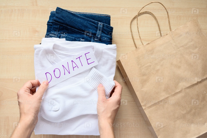 Женские руки собирают детскую одежду для пожертвований. Вид сверху, выборочный фокус на одежде