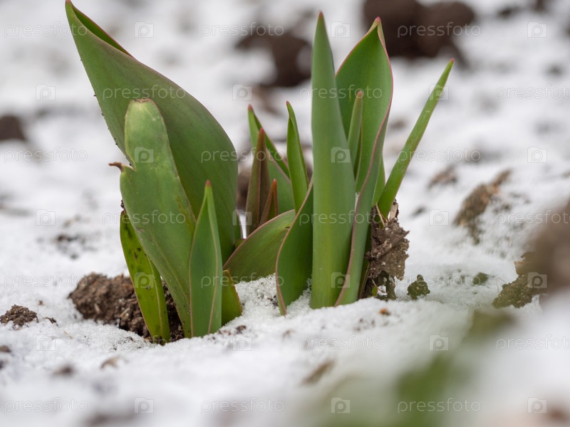 Ростки тюльпана на фото макроса ранней весной. Тюльпан прорастает ранней весной на заснеженной почве. Зеленые листья тюльпанов в весенний день в саду