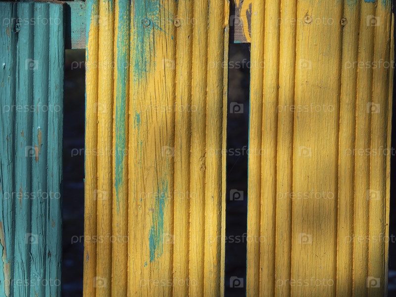 Деревянные желтые и синие доски текстуры фона. Деревянная поверхность имеет желто-синий цвет, текстуру или фон. Изношенные полосатые старые окрашенные доски