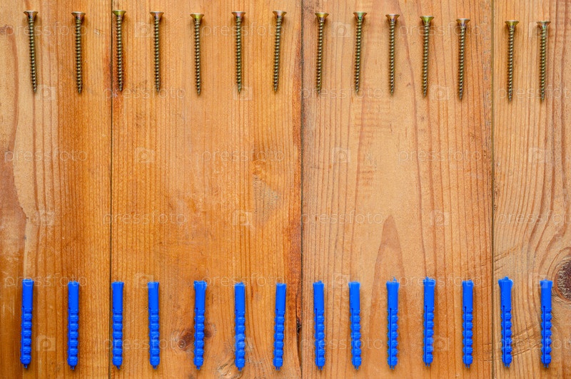 Фон на тему строительства с пустым белым пространством в центре кадра. Сверху ровно уложенные саморезы, снизу ровно уложенные пластиковые дюбеля. Вид сверху