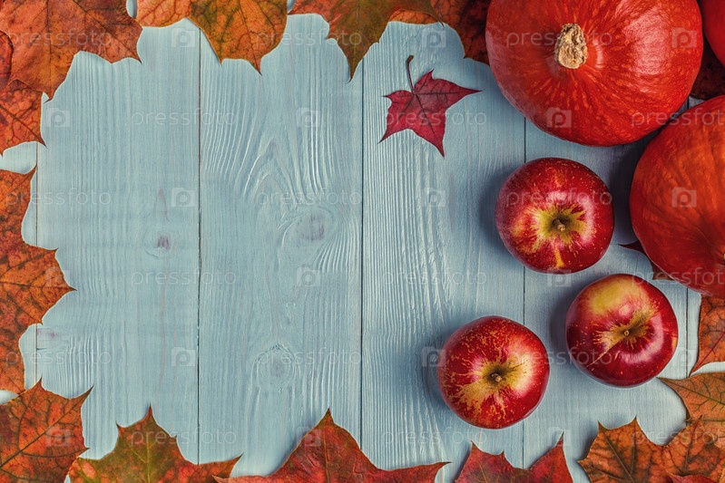 Осенний фон с цветными листьями и тыквами на деревянном фоне