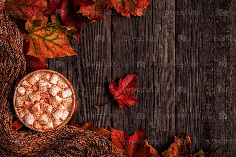 Осенний фон с горячим шоколадом, вязаный шарф, разноцветные листья