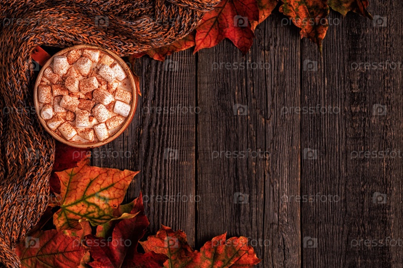 Осенний фон с горячим шоколадом, вязаный шарф, разноцветные листья