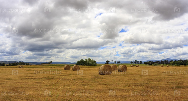 Спелые стога пшеницы на поле, сельский осенний пейзаж
