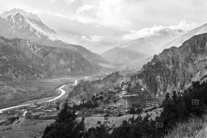 Долина реки Марсянди. Буддийский монастырь в горной деревне Брага в Непале. Гималаи, заповедник Аннапурны