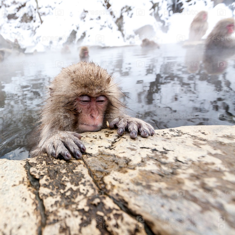 Милая японская обезьяна спит в горячем источнике, Япония, префектура Нагано