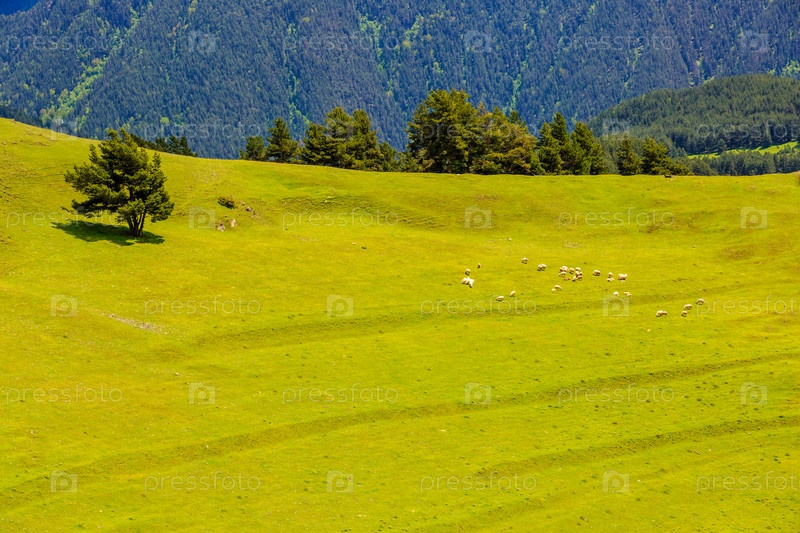 Овцы пасутся в зеленой долине в горах Кавказа. Грузия, Тушети