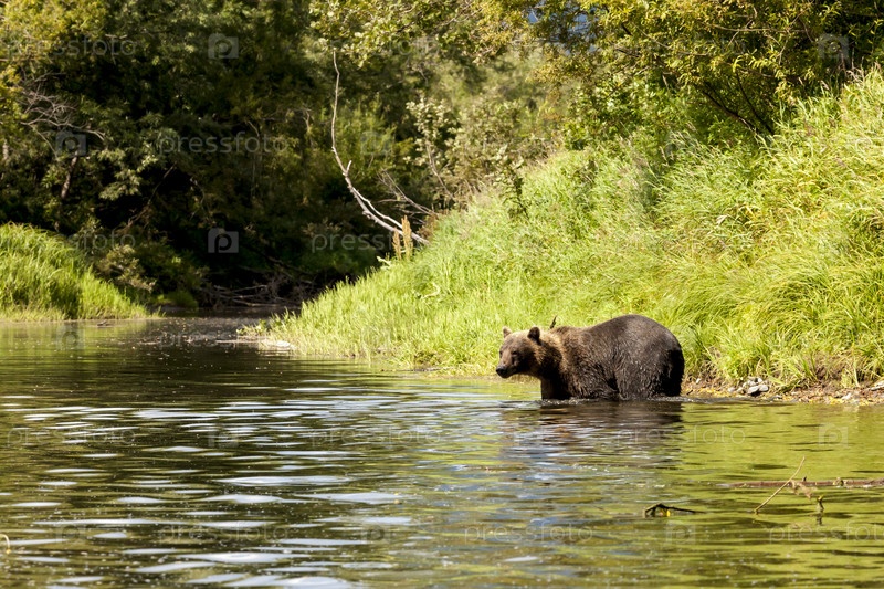 Бурый медведь (Ursus arctos beringianus) ловит рыбу в реке Камчатка, Россия